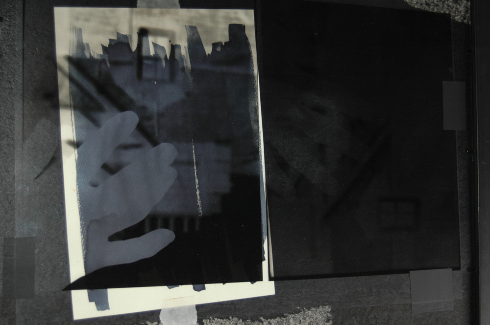 As part of my residency I undertook to turn the space of a pottery into a “Camera (room) Obscura”. In this space I exposed directly the view gathered from “outside” onto photographic paper as a collage of interwoven documents. The cyanotype printing process was employed in field-studies using the sun to recording the movement of the earth. A single day spent charting the suns shadow through an architectural space-frame on the lawn at Kilquhanity resulted in a “pathway between sunrise to sunset”.