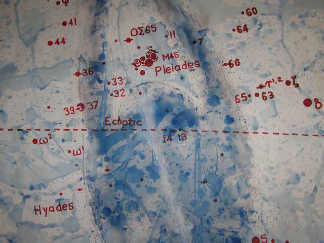Pleiades (detail) from a star chart superimposed over a figure on Flickr.