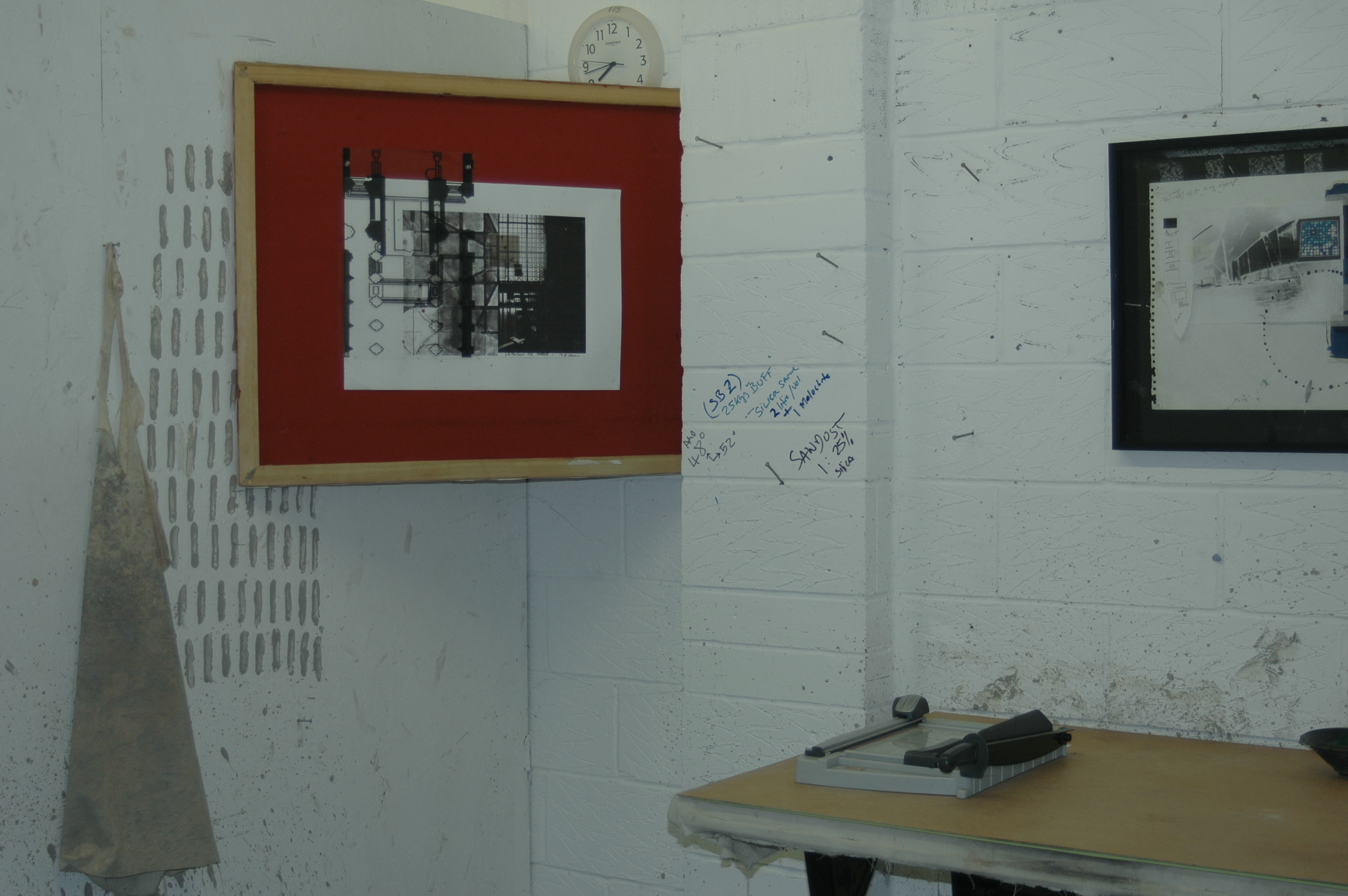 This working space hosts various activities and interests. Framed collages originated from on-site speculations now merge with the marks of clay. Whilst sealed, glazed and pierced drawings simultaneously reflect on a “liminal” architectural presence under construction by the imagination.