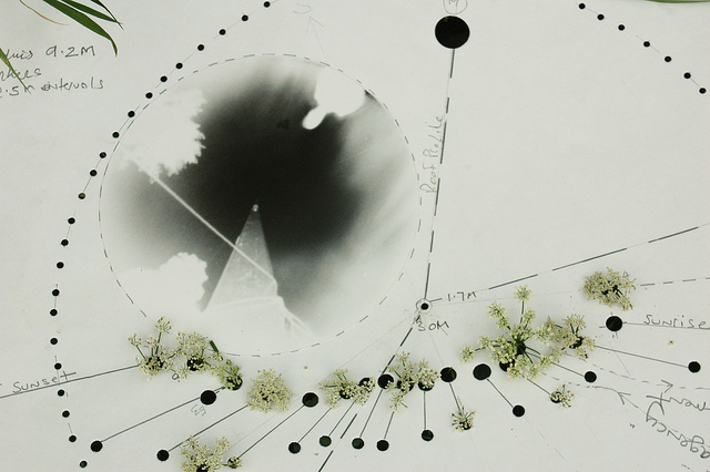 Site drawing from “a pathway between sunrise and sunset” staged at Kilquhanity, Scotland 2011. This research has led to notions of architectural “interventions” and “footprints” through the direct observational mapping of celestial alignments and movements as they permeate with the landscape.