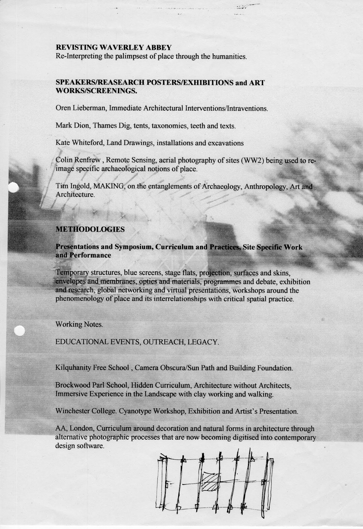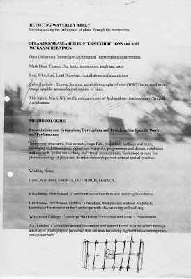This research and its design proposal are centred on the arts and the humanities and their ongoing function in our contemporary society. The emphasis of this inquiry is located by the spatial practices of architecture, fine art and performance. My project is a field event and symposium that would be able to host intellectual dialogues, lectures (TED) workshops, performative events and exhibitions. I am particularly interested the relational production of social spaces and the aesthetics of builtspaces, both historical and ephemeral. The proposed use of Waverley Abbey near Famham as a possible site and retreat for this venture is valid as it links a possible interdisciplinary territory of anthropology, archaeology, art and architecture. Tim Ingold (Making) Colin Renfrew (Figuring it Out) and others have for many years been researching and mapping this new spatiality.