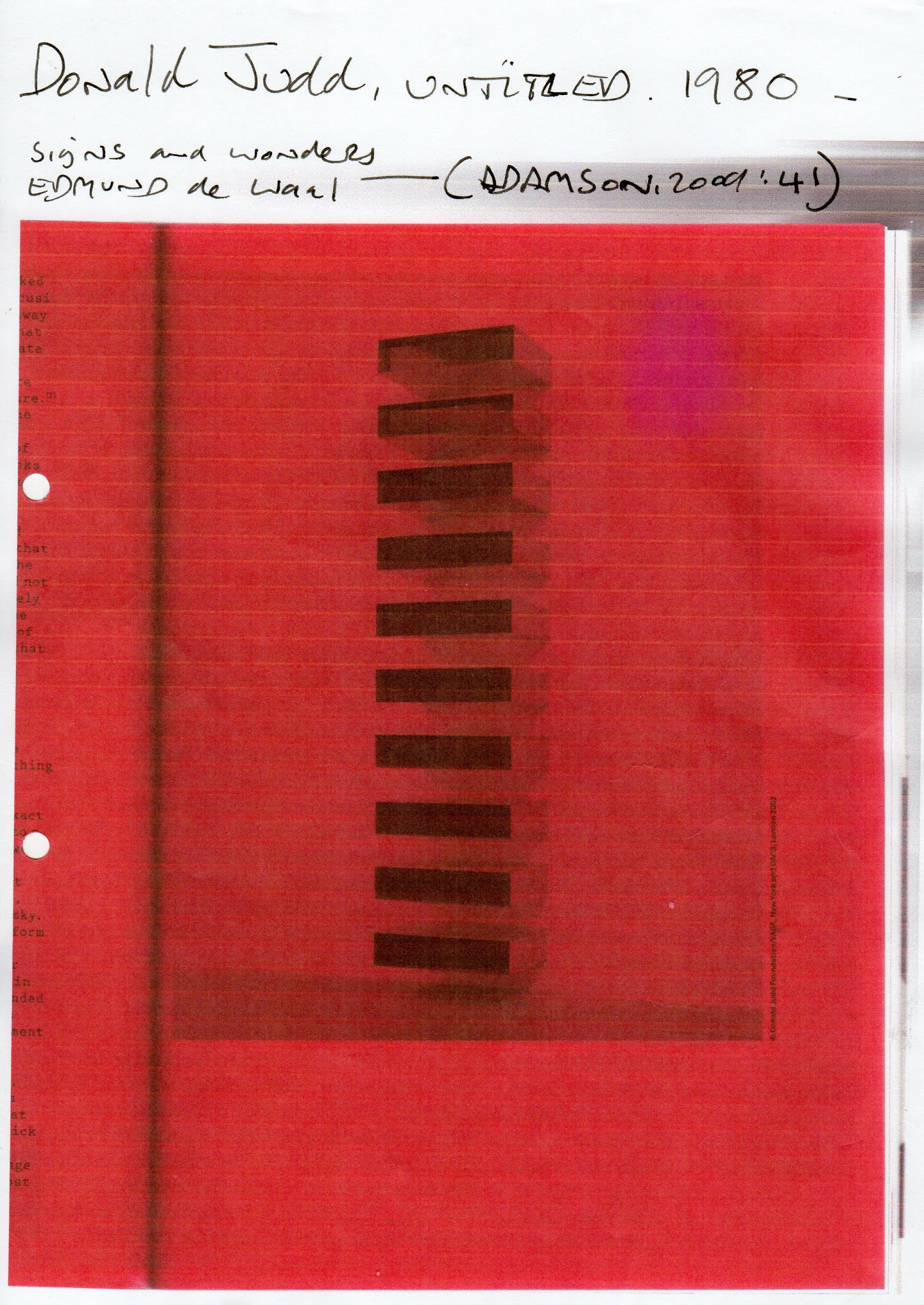 ‘Judd’s sculptures occupy an uncertain middle ground between craft and industry. He did not make anything himself; instead he worked closely with a team of highly skilled fabricators. The results have the impersonal, serial quality of mass production, but an intensity of finish that can only be achieved by artisanal methods.’(Adamson,2009:40)