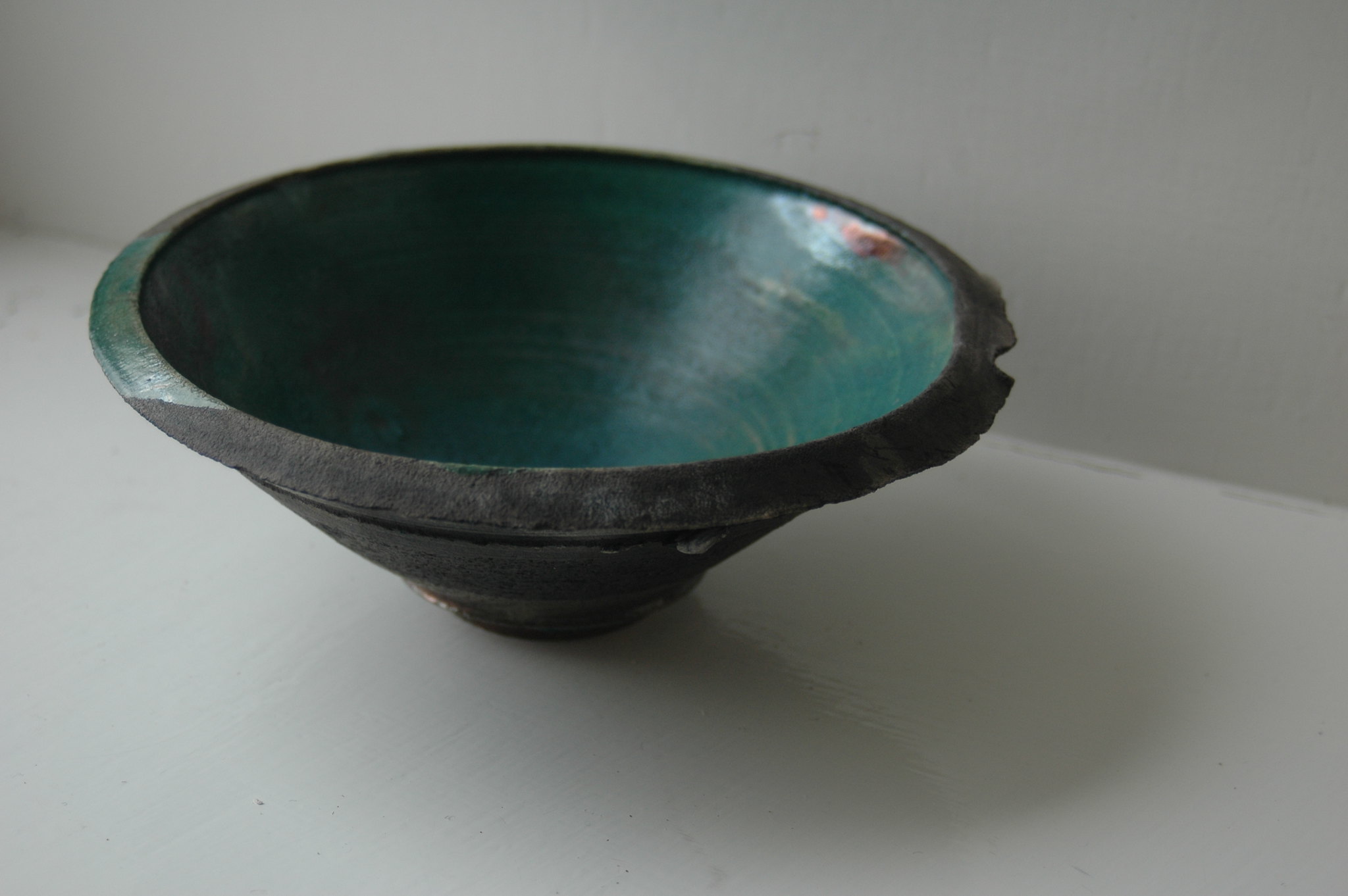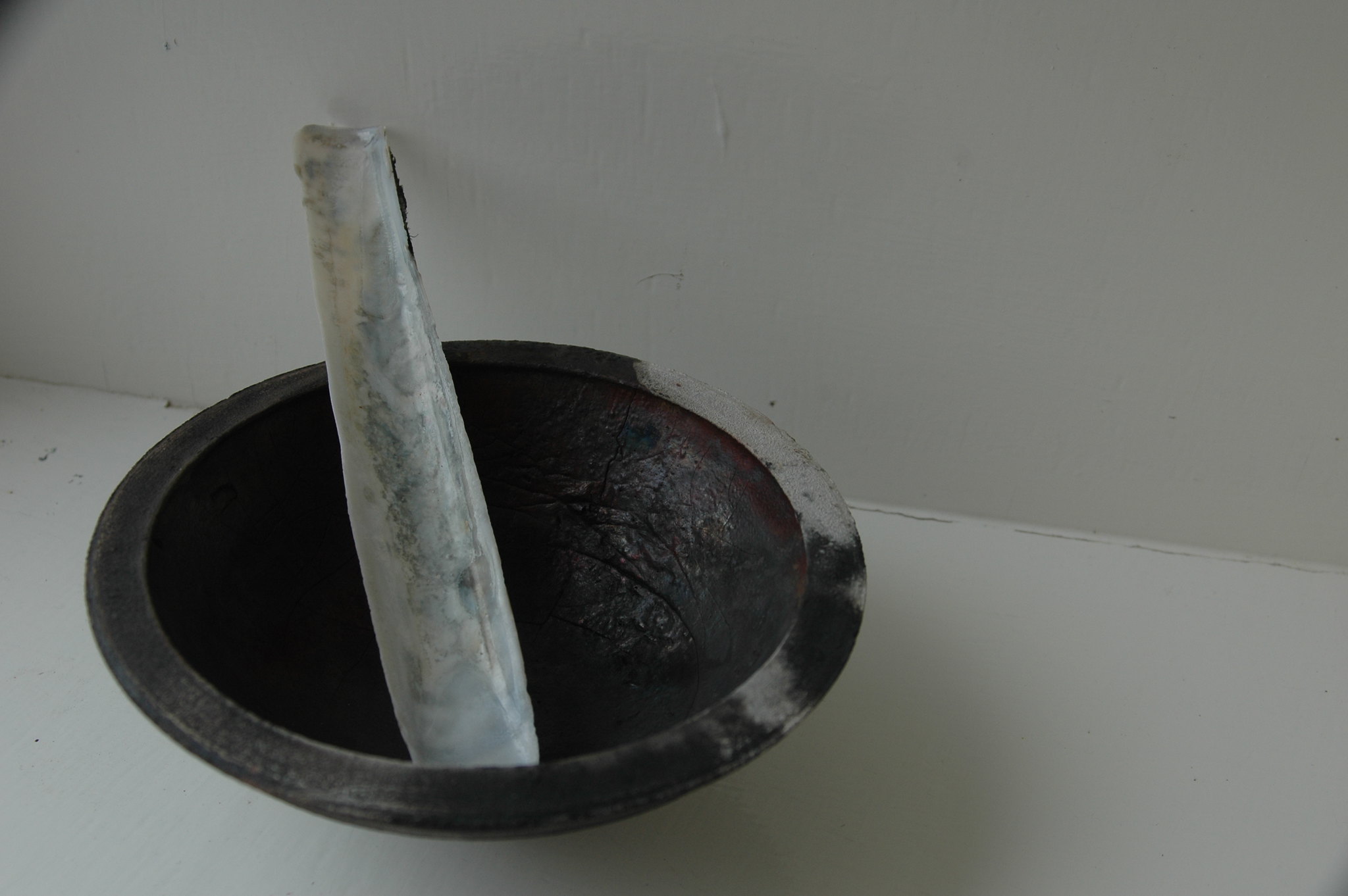 These vessels were originally thrown on a momentum wheel situated in the small niche like space of a scriptorium. The interiority of the bowls seek to reflect the quietness and openness of a ‘retreat’ through material and the muted light of its surroundings. A post firing process was employed of removing the bowls and their still molten interior into a chamber excavated on the beach to become reduced by local organic material and to cool. Once cooled the bowls were washed in the Irish Sea to reveal their glazed interiors for the first time.
