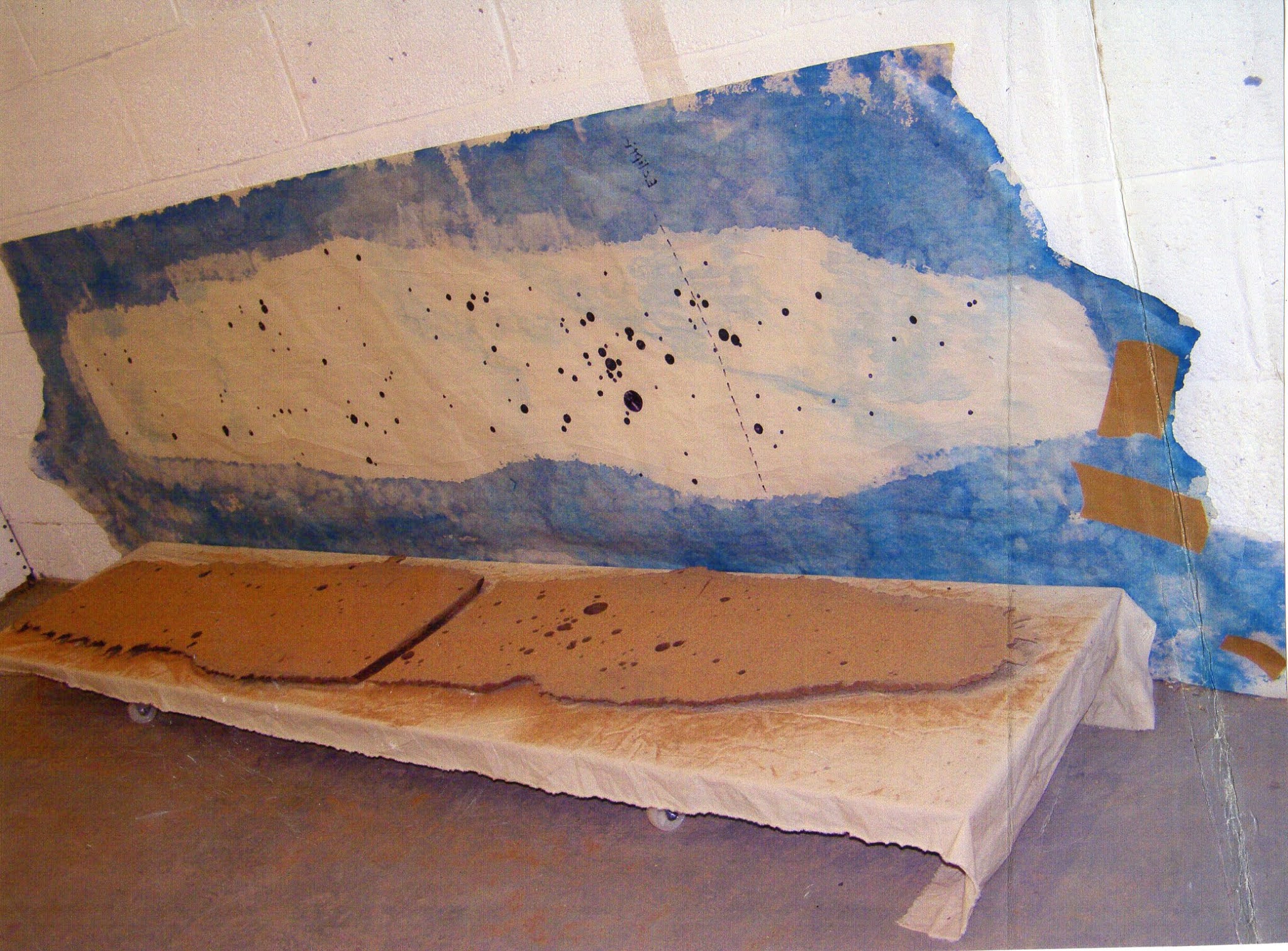 These distinctively different yet closely related works are arranged with the clay piece on its custom made trolley with its calico material that acts as a sheet on which the clay work rests. The drawing is placed behind it fastened to a wall with the drawings bottom edge just making contact with the floor adjacent to the castors that grant the clays supportive trolley mobility. The clay work has a direct relation to this adjacent drawing, the drawing is revealing the traced female that is just discernable on the surface of the clay. On closer inspection of the drawing it is just possible to see a rubbing taken from the periphery of the clay form. Both the paper and the clay seem to be in some reflective mode of mutual intimacy, marks transferred between one another during the manufacture of both are subtly replicated on the form of one and the surface of another. The pierced clay slab (vessel) is the first visible casualty of the entropic process of shrinkage. A significant crack separates the clay vessel into two separate but unique entities that share the same defect as if they were still whole. This division through the continent of the body has been subtly marked by the raised furrow of silica deposited when the clay bodies were in closer proximity. The calico has also rendered a new visual territory around the entire periphery of the form, created by the deposited silica sand and the resultant shrinkage that is taking place. There is the sense of this form moving in two dimensions, creating an extended footprint of previously covered territory whilst continuing to shrink bodily within the details and markings on its surface. This phenomena seems to give the piece a strange complexity of both temporality and a duration on which that temporality is directly charted, the calico is instrumental in registering this perception. The agencies of both the silica sand and the calico sheet between them regulate and guide our understanding of the observation of the clays infinitesimal shrinkage. The compression of the clays structure due to its shrinkage increases its density and visually alters the arrangement of the piercing that are mapped over its surface, the concise circles and holes cut through the clay have now blended into the overall tension imparted by shrinkage, there is a sense that precision of the marks, their machined appearance which contrasted to the locality to the clay around them has been lost, reclaimed by the inner natural torsions taking control of the piece as a whole. The clays surface with its sandy granular deposits whose particle size has become visually larger at the expense of its hosts shrinkage now auger for a territory, a land mass devoid of water, the sense of this territory becoming anhydrous, giving rise to thoughts of thirst and fragility, even the once precise holes give the impression of barren watering places isolated within a landscape in a state of drought. The once visible markings are now obscured by the action of the shrinking territory and its granular coating as it now gains in its ability to obscure features. The traced and drawn female form is still harboured somewhere under this obscuring sand. Yet she now resides as a brittle uncompromising inscription of her former self, the plasticity that once gave her a sensuality into the yielding and pliable surface has succumbed to the unstoppable internal shrinkage of the clay particles starved of moisture. The clay is acknowledging the atmosphere of its given surroundings, our environment.