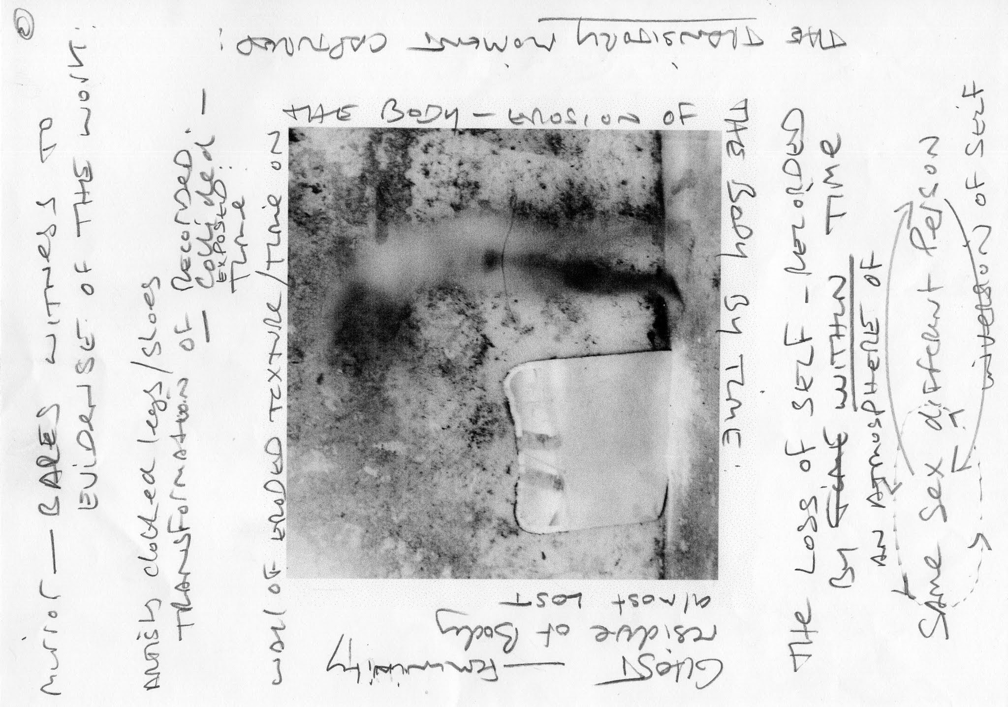 Francesca Woodman’s use of the camera’s ability to witness and document, is subverted into a personal language of aggressive tactility and the notion of the body’s identification being partially hidden or even lost; just its trace remains recorded in the latency of the camera’s recorded time.