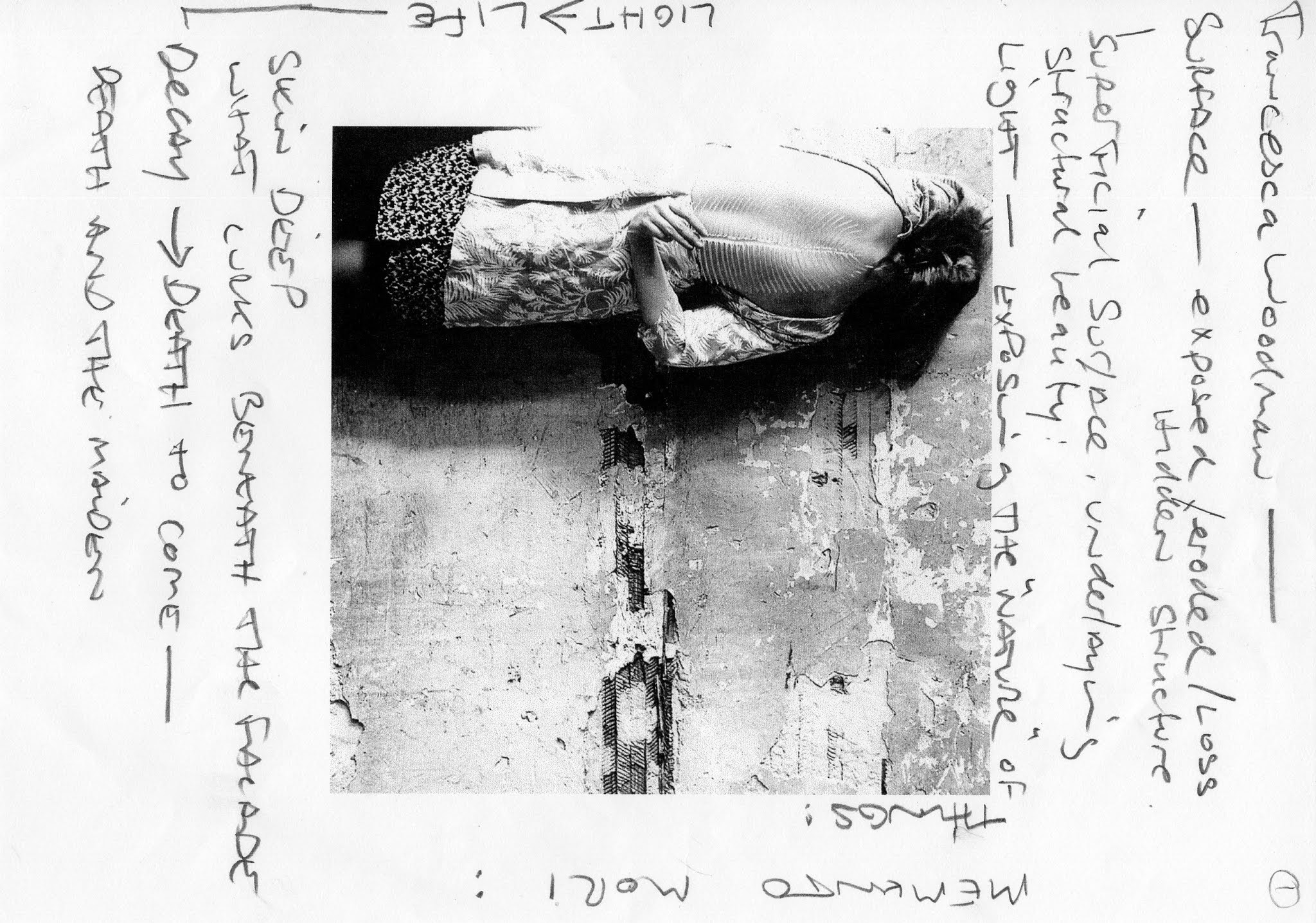 Her work seems to have an inherent almost codified, femininity, probably due the semiotics and symbolism of early surrealist influences. She performs, re-enacts and exposes her body for the witnessing of the camera. She seems to, fleetingly, seduce and then disappear, just leaving a trace of her being, her sexuality and its actions, entrusted to the fragility of the light sensitive gelatin. (extracts from The Body, Francesca Woodman and Antony Gormley, WSA Russell Moreton 2006)