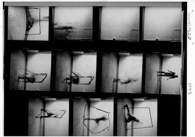 These performative images and her relationship to the pictorial space, her body traces, are witnessed and further manipulated/annotated by drawn lines enclosing and creating other spaces.