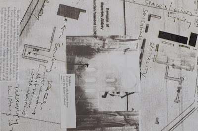 The Scriptorium began through a research of both architectural themed texts and documentation of the site, and creative practice involving photography (digital, analogue and film) art practices of collage and drawing. The many visits promoted my own subjectivities to the site and these were also frequently subjected to change by the intervention of others in unexpected ways, these social intrusions by other revealed the very boundaries that the historic site engenders, some playful other malicious. These extremities within the social order of the visitors became problematic in designing for the site itself. An earlier proposal to host a Symposium centred on the Arts and The Humanities, that would use the Abbey and its surrounding ground appeared to be a project of vast diversities and logistics better suited to a cultural project through arts management and funding. As the project developed certain creative methodologies around particularities of the site itself began to appear, the notion of palimpsest being one of them. This promoted the idea of a reading room, as an ephemeral interior space that gathers up the experiential values of ‘ruins’ and re-enacts them as a site to explore the architectures of images. It became apparent that ‘palimpsest’ could be both a visual surface of erasures, earlier markings partially over written by newer ones ‘annotations’ and it could be a scaffold of developing ideas clearly visible merging as adaptations into the very usage of the site.