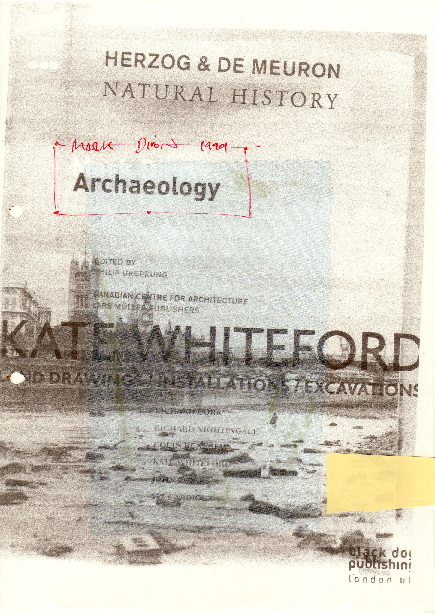 Taxonomies and Subjectivity/Spatial Narratives of Layered Space (Spatiality) Mark Dion, Archaeology, Thames Dig.(Allegories of a pseudo-archaeology) Herzog and De Meuron, Archaeology of the Mind/Natural History.