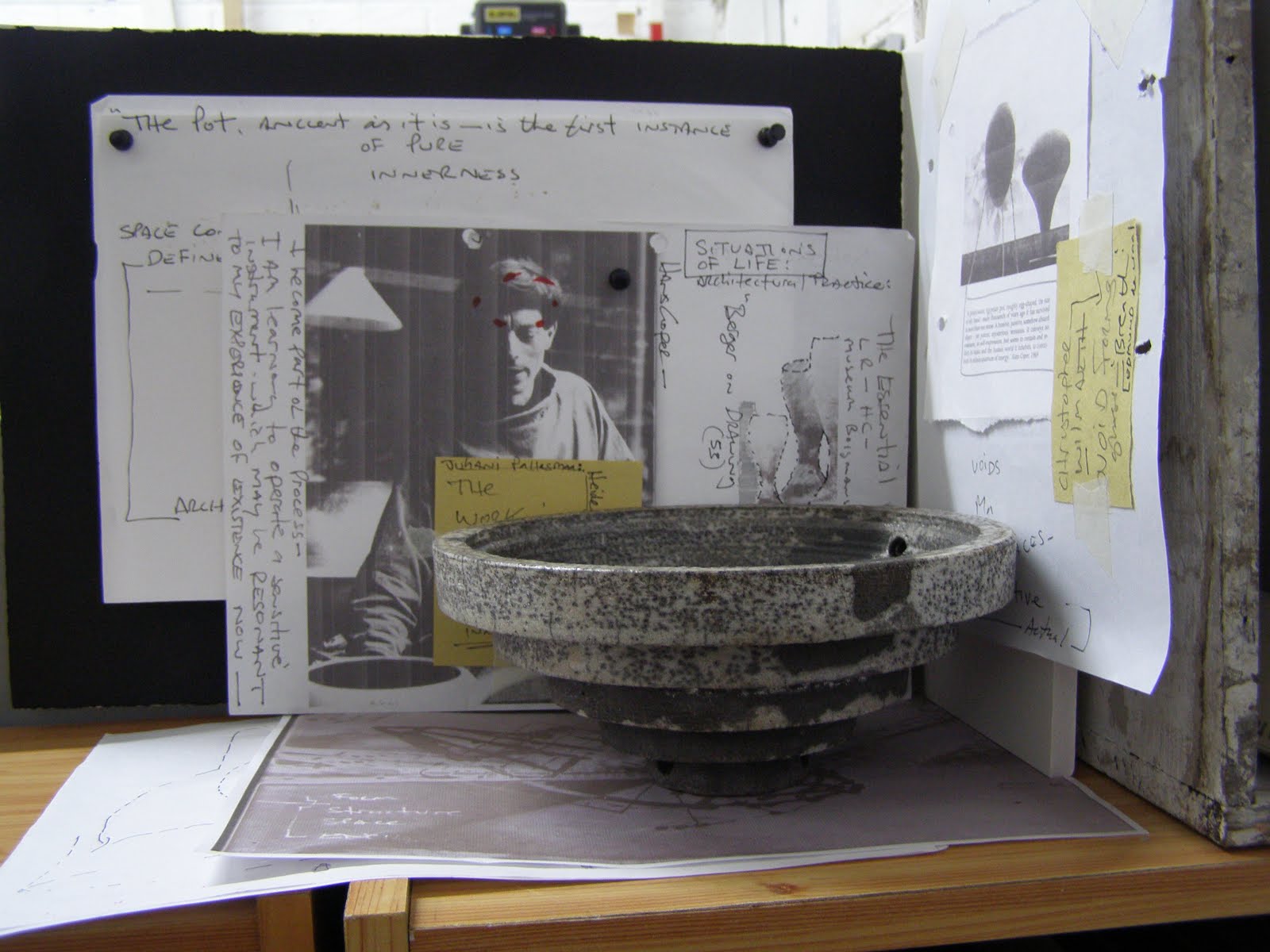 We return back to the urgent need to make and experience things that in someway that lead us back to ourselves. The creative architectural work of Peter Zumthor is something that I am engaging with. He has developed architectural design practices that consider each project in terms of a comprehensive and encompassing sensory experience. He looks beyond the mere physical form and its fabric. He attempts to address issues of the body and how it may interact within a built environment. The use of memory as a spatial narrative to accompany the atmosphere of his spaces is realised through evocative material surfaces and densities. I feel that there is a synergy here between the opening up of the interior of a pot and the opening up of a space to dwell in.
