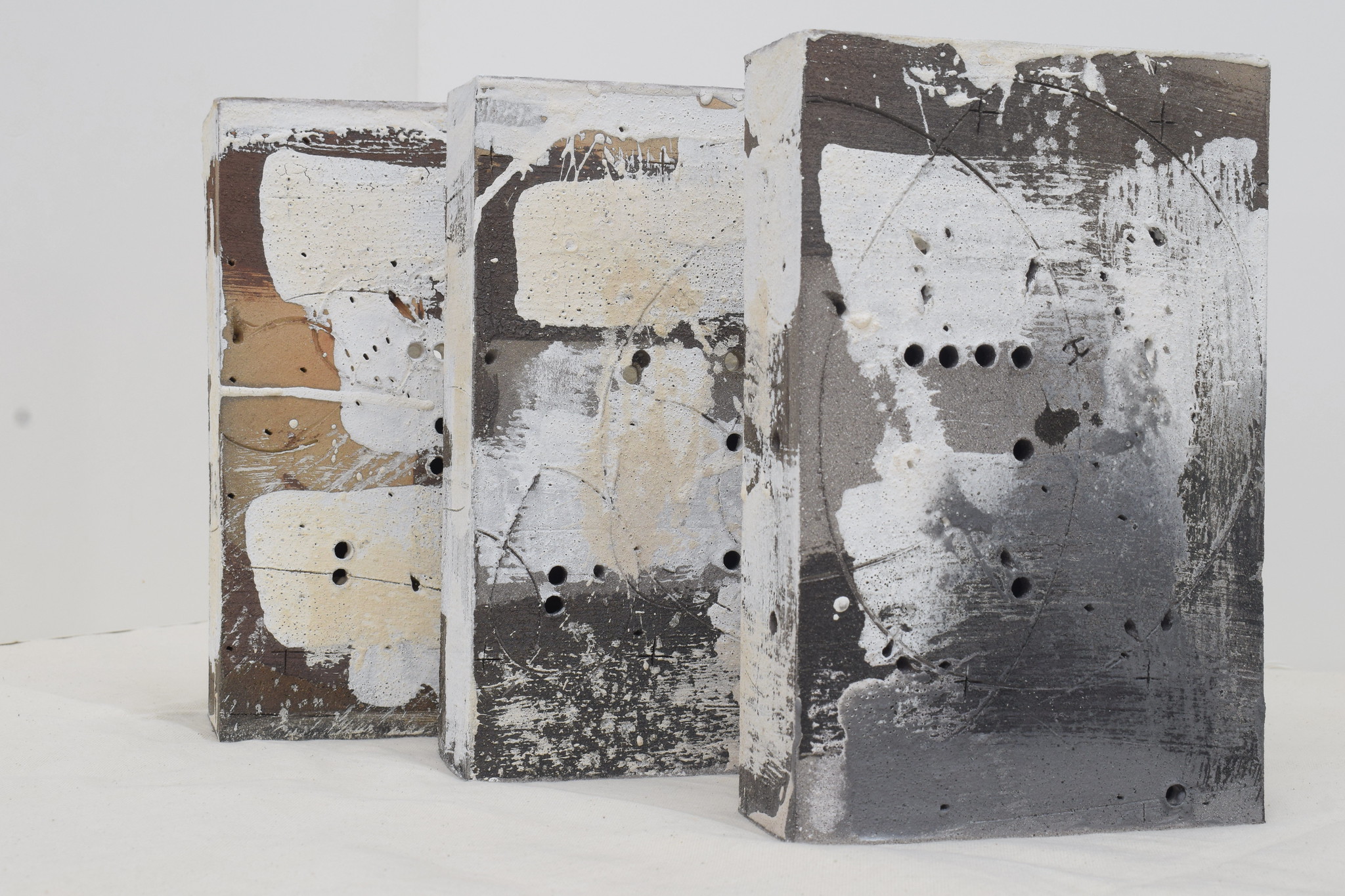 His practice investigates the interconnectedness of making interior spaces. These works in clay are processual in nature, developed by a need to demarcate and fold material into spatial forms and volumes. The act and gesture of drawing further adds ephemeral marks of process amongst the materiality of the built spaces. Clay slips and other incised marks on both sides of the clay are all interwoven into his spatial forms.