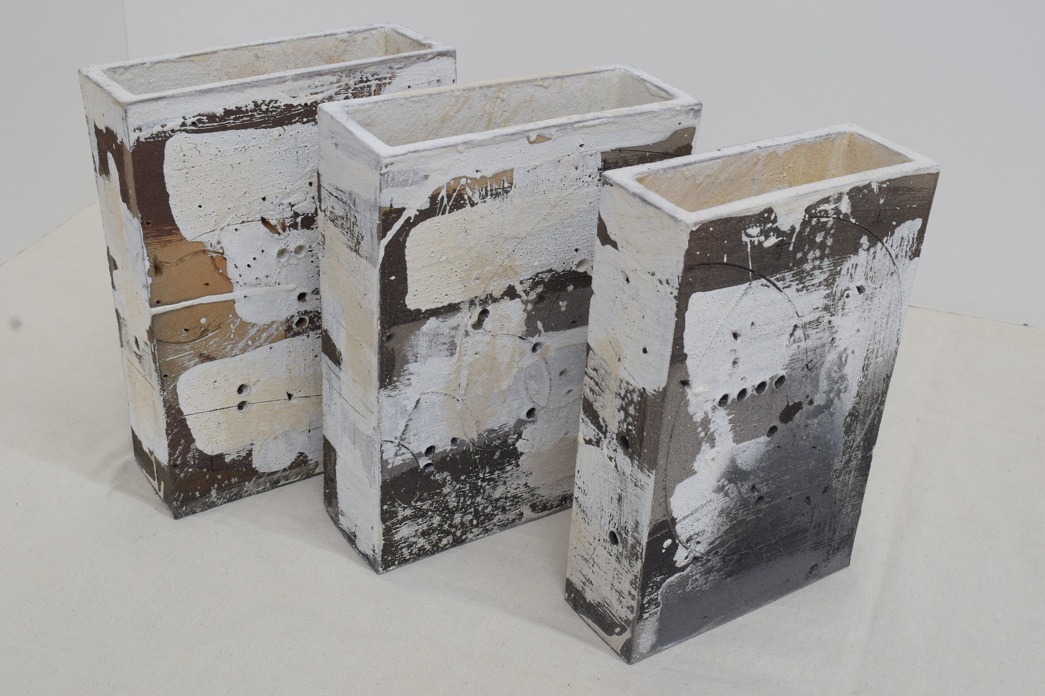 These are ceramic sculptural objects created by artist Russell Moreton, likely part of his “Clay with Fire” series.