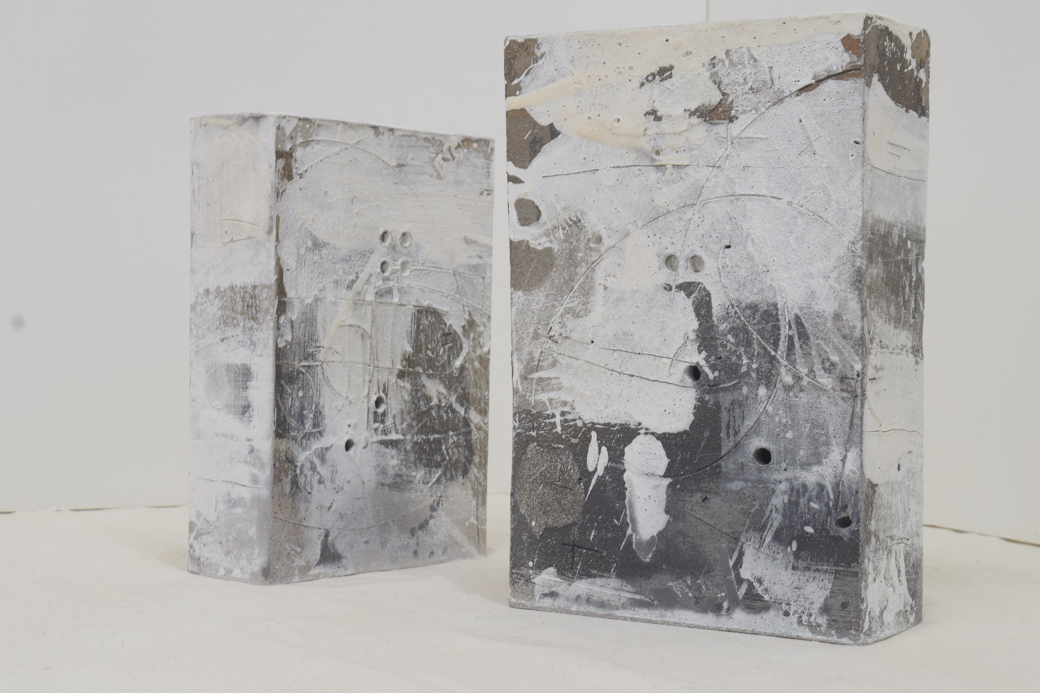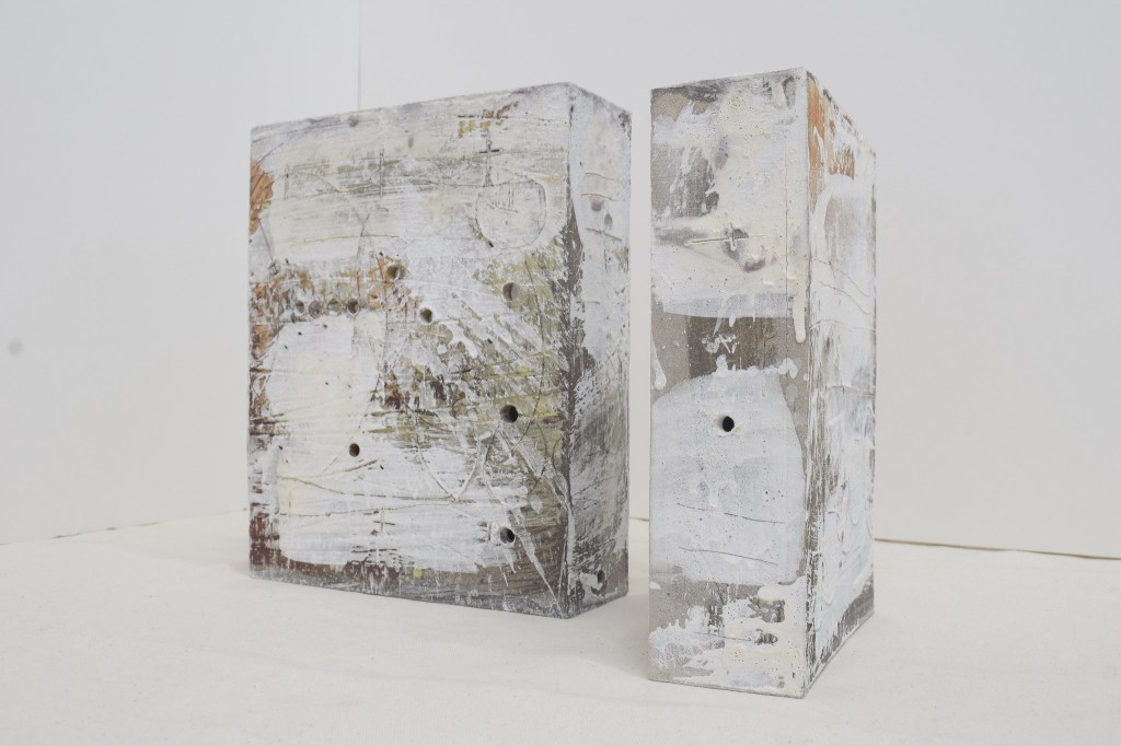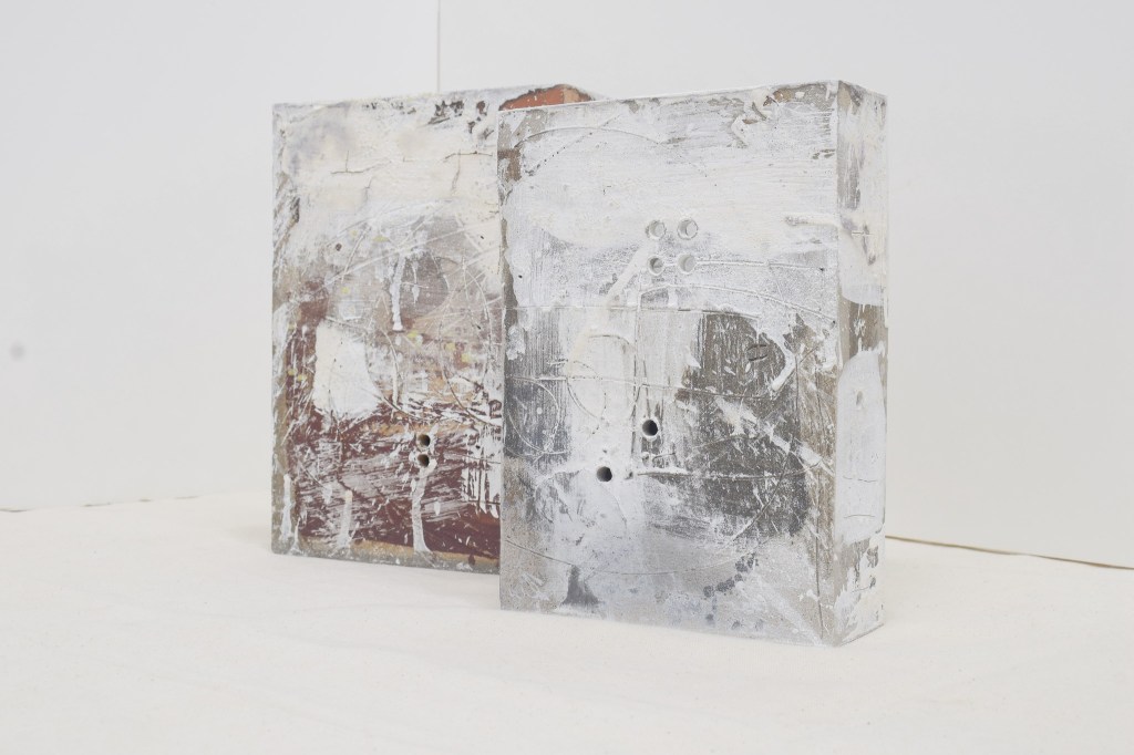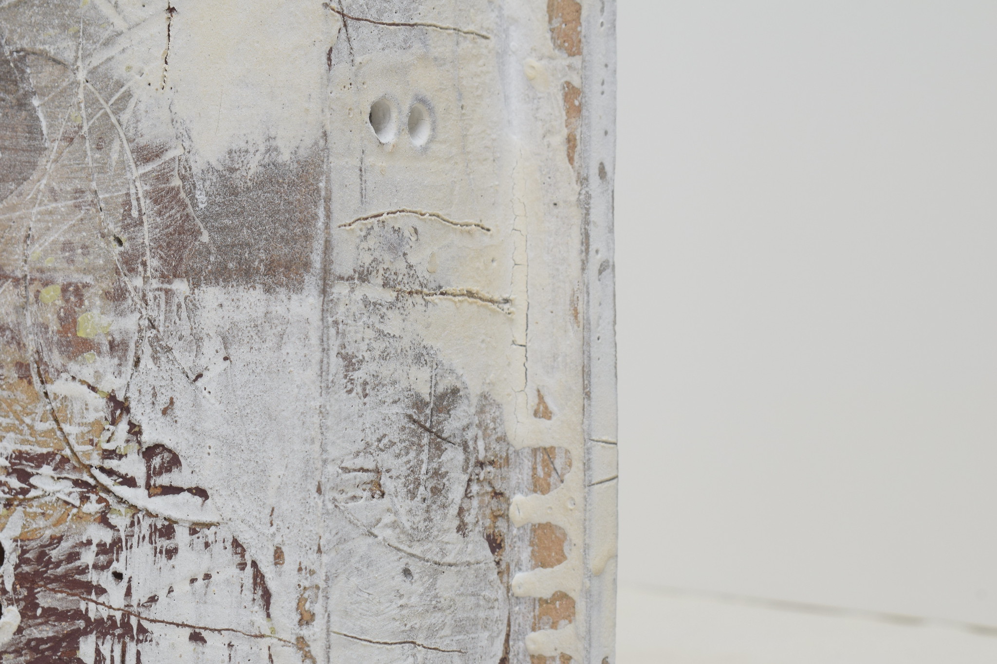 The raw, distressed appearance suggests an interest in material vocabulary and process-based inquiry.