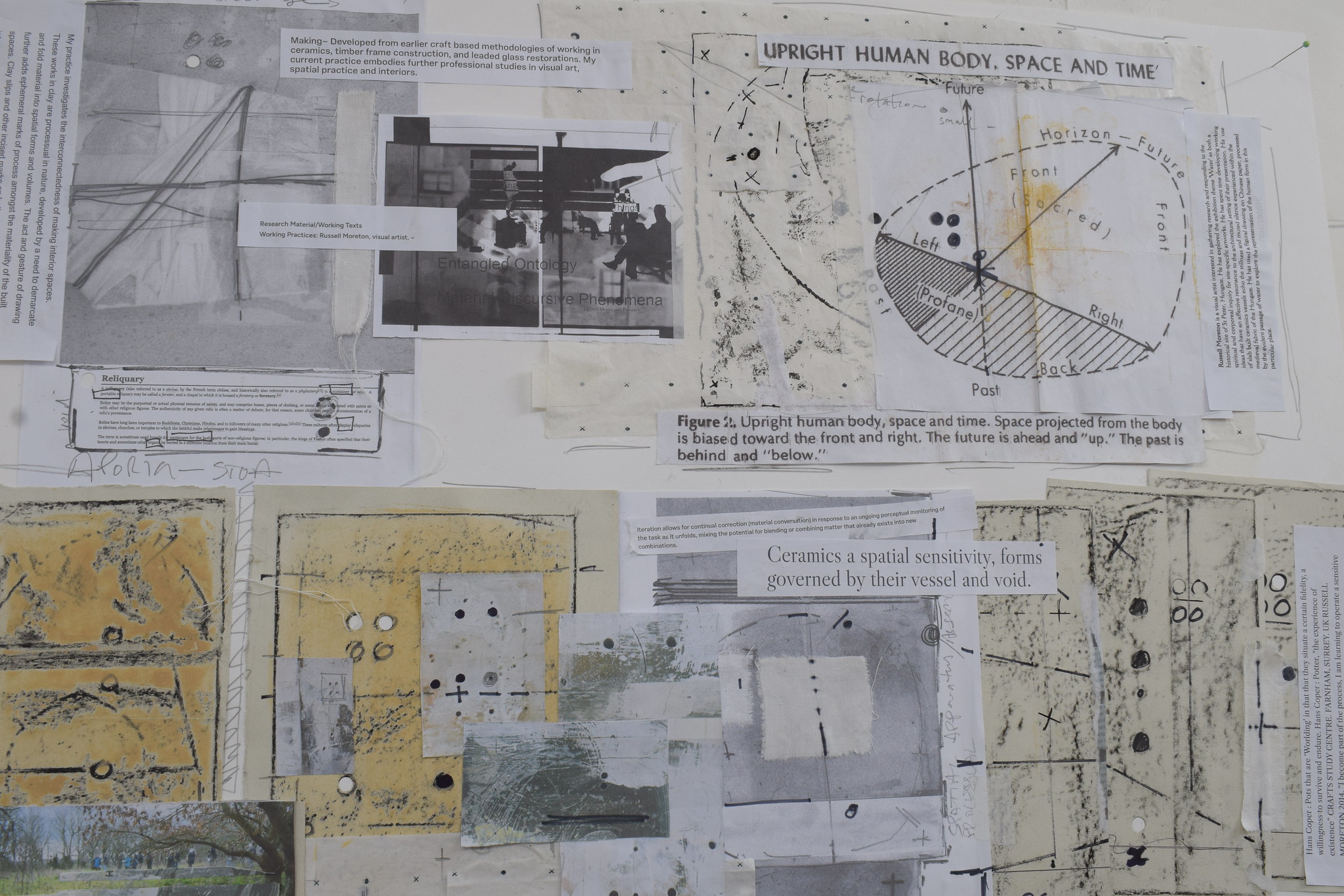 Slab built forms from clay slabs that have previously been drawn into and brush marked with slips. Assemble forms then divided into several spatial interiors. Piercings through the surface set up a circulation for light to enter into the interiors. Further firings and more ceramic coatings are applied to further investigate the involuntary relationships that have emerged. These objects are unknowable as they are extracted from the kiln, and as such they act as forms that can take on a theoretical nature, gathering my discursive researches and readings into a performative spatial body.