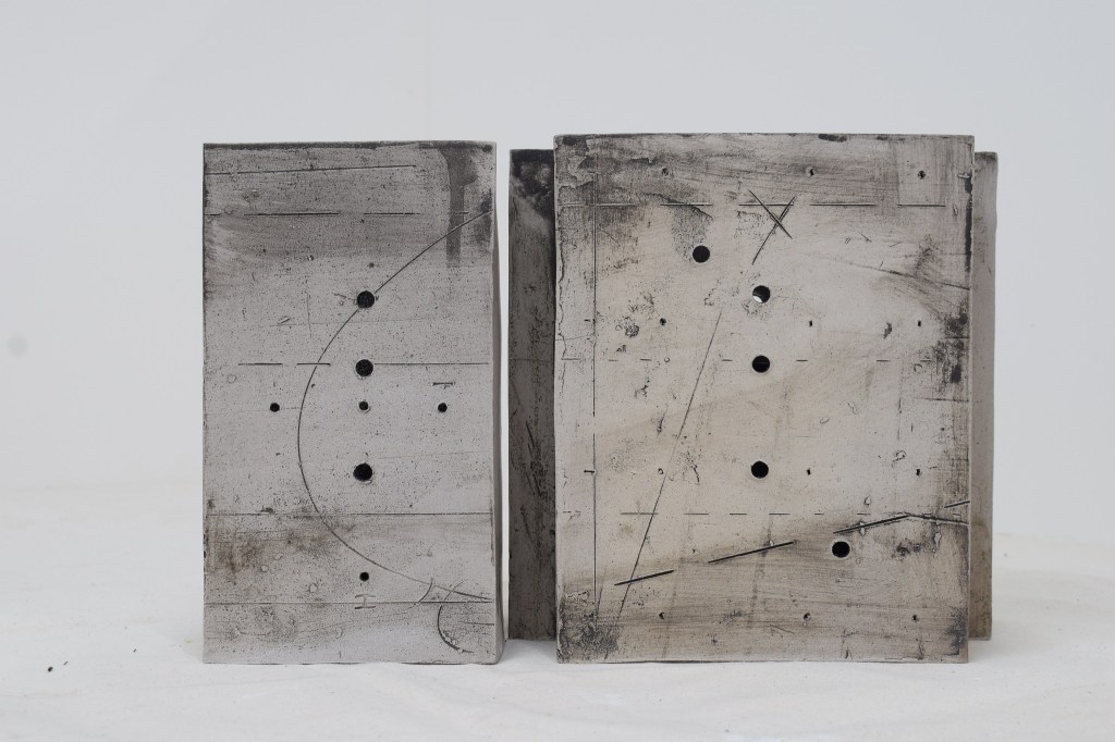 Slab built ceramic from templates and drawn annotations added throughout the construction process.