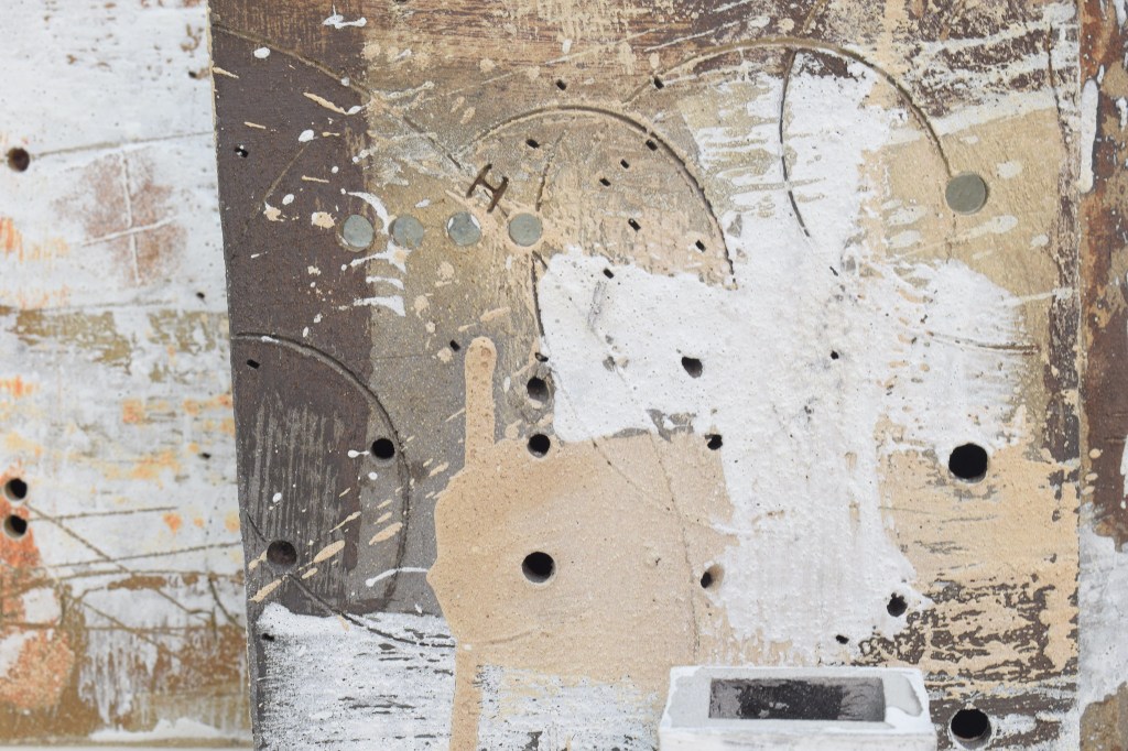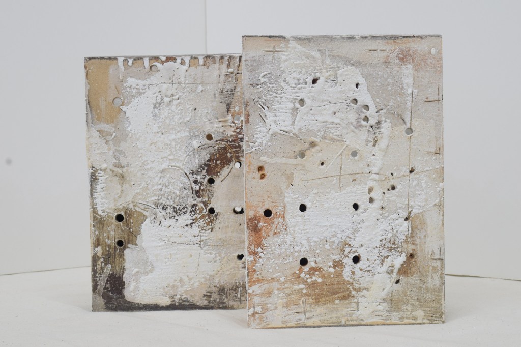 These are mixed-media ceramic artworks by artist Russell Moreton, part of his “Clay/With Fire” exploratory research.