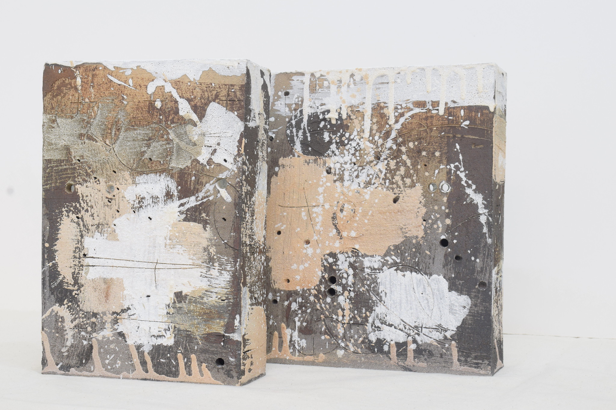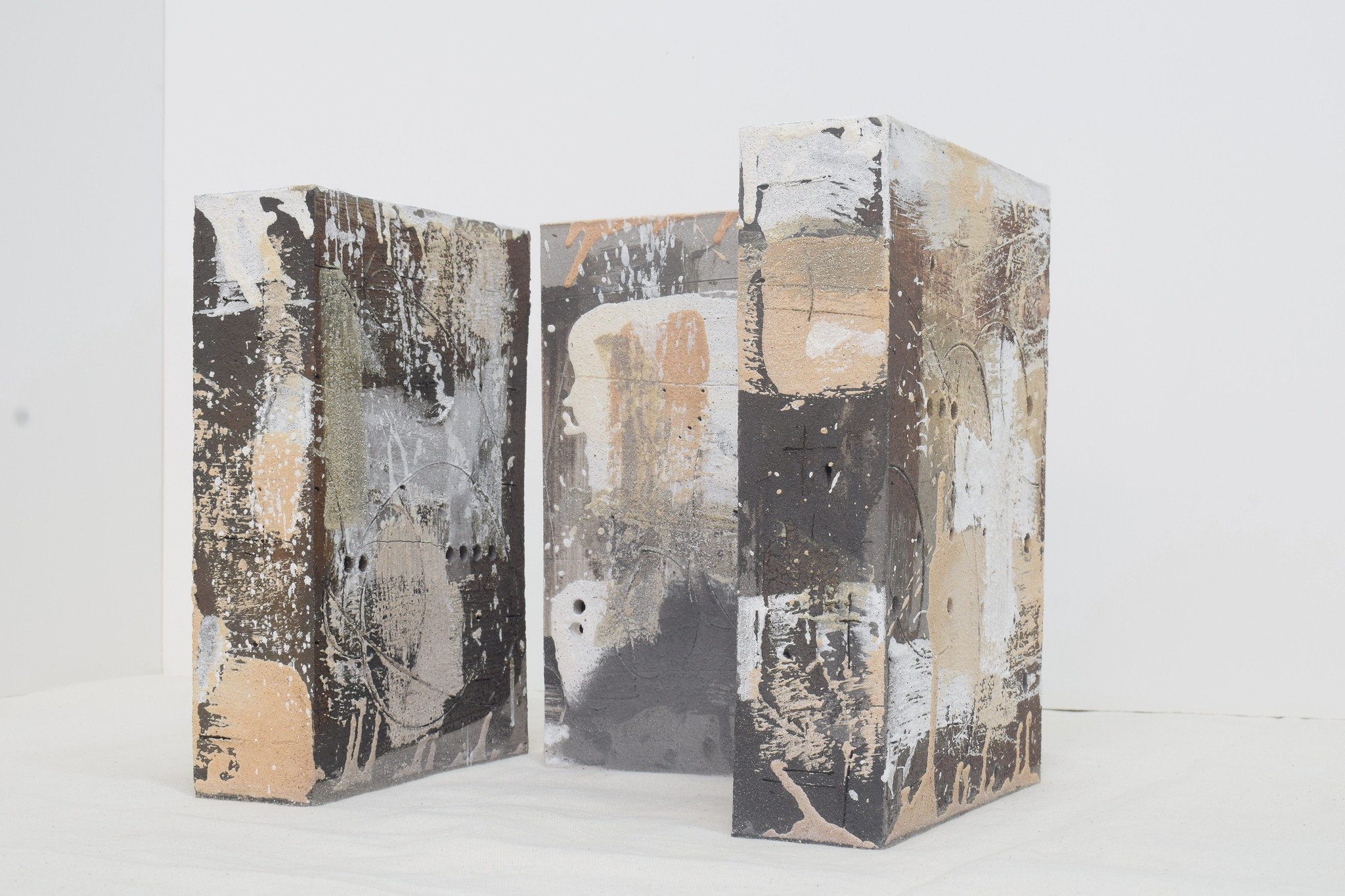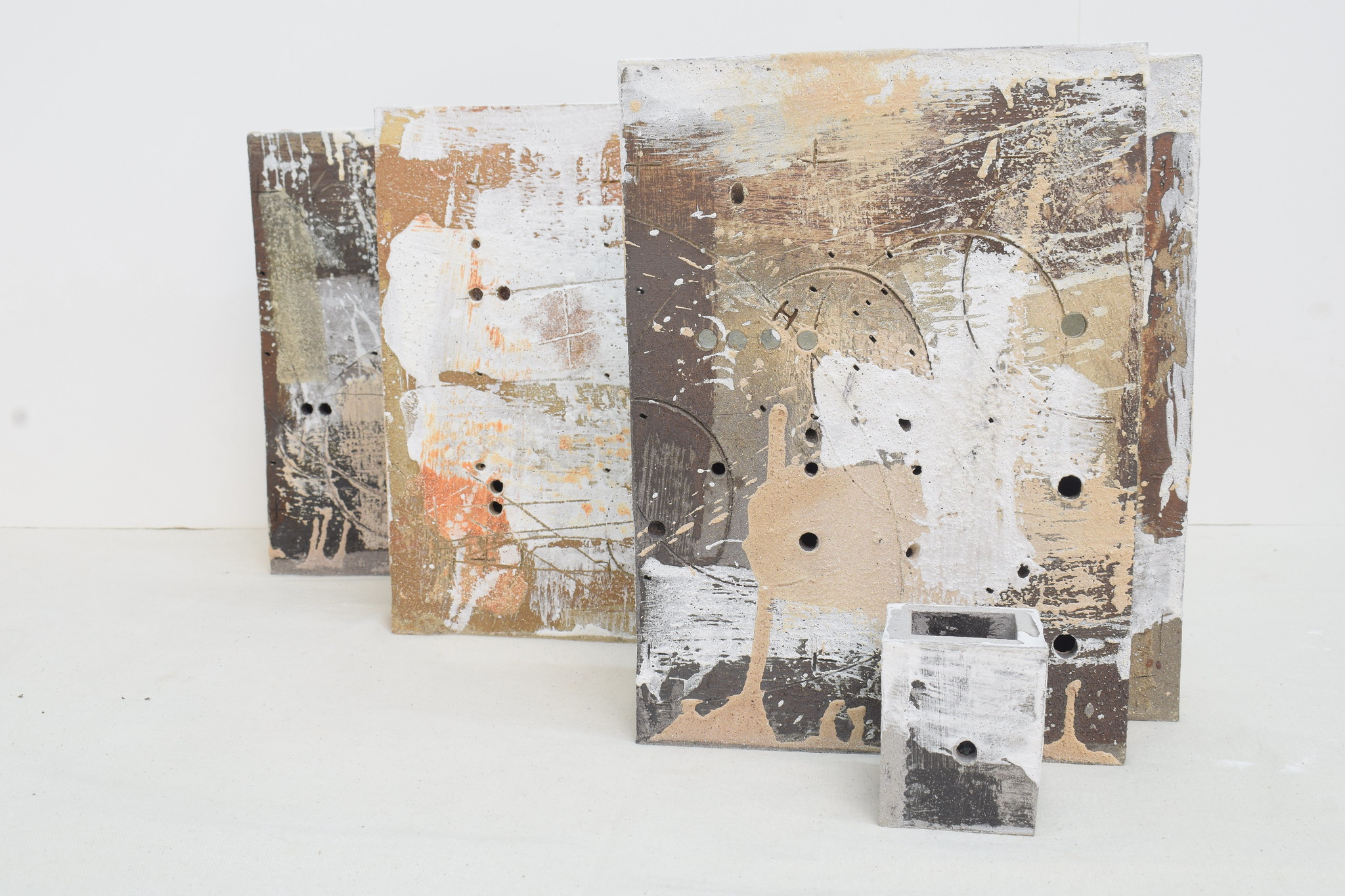 These are mixed-media ceramic artworks by artist Russell Moreton, part of his “Clay/With Fire” exploratory research.