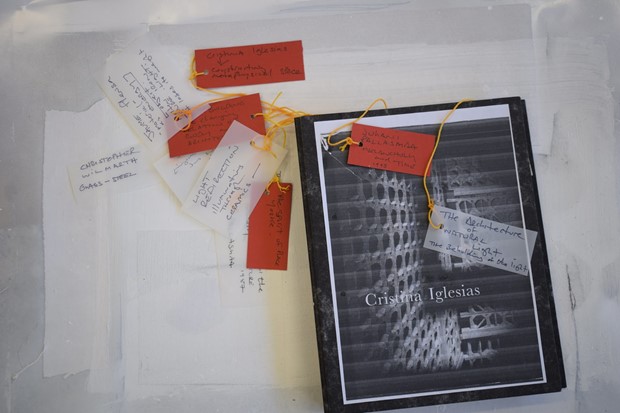Paintings displayed with large analogue phonographic images and collages Architectural concerns, coloured glass, aesthetic surfaces, paintings with raw materials Installation of research bookcases as diffractive elements/spatial practice within the studio White paintings, used layers of paper texts, meshes and cloth