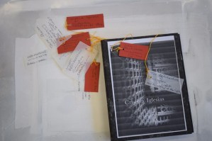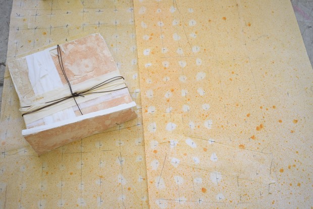 Research material, folders, wrapped ceramics with fabric, yellow ochre on paper