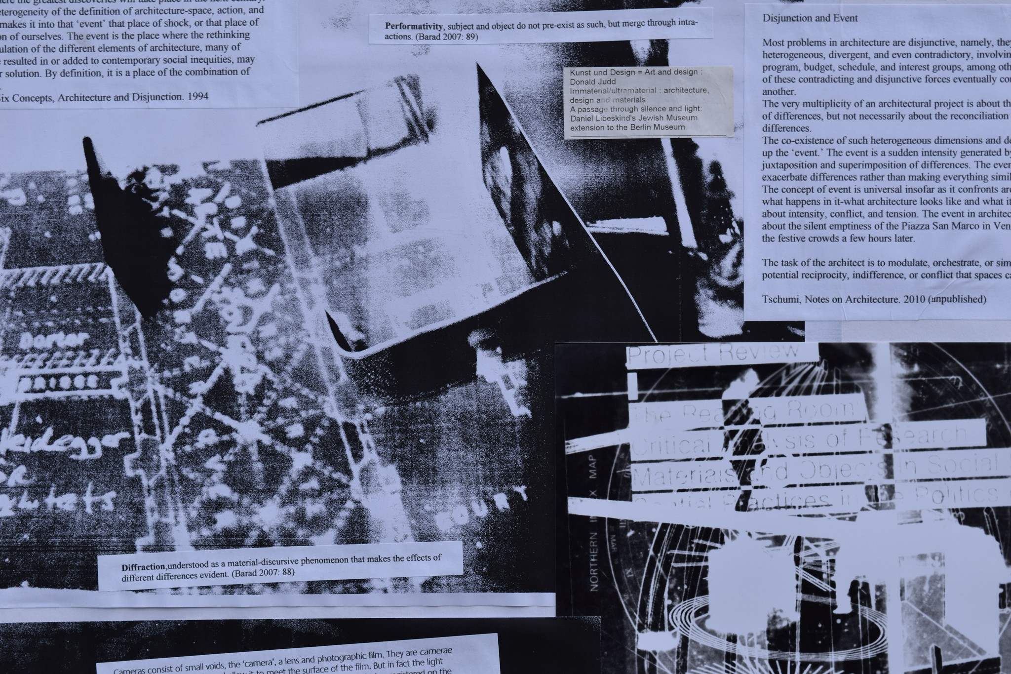 Photographic drawings, collage, montage, interventions through designed walls/pathways/interactions.