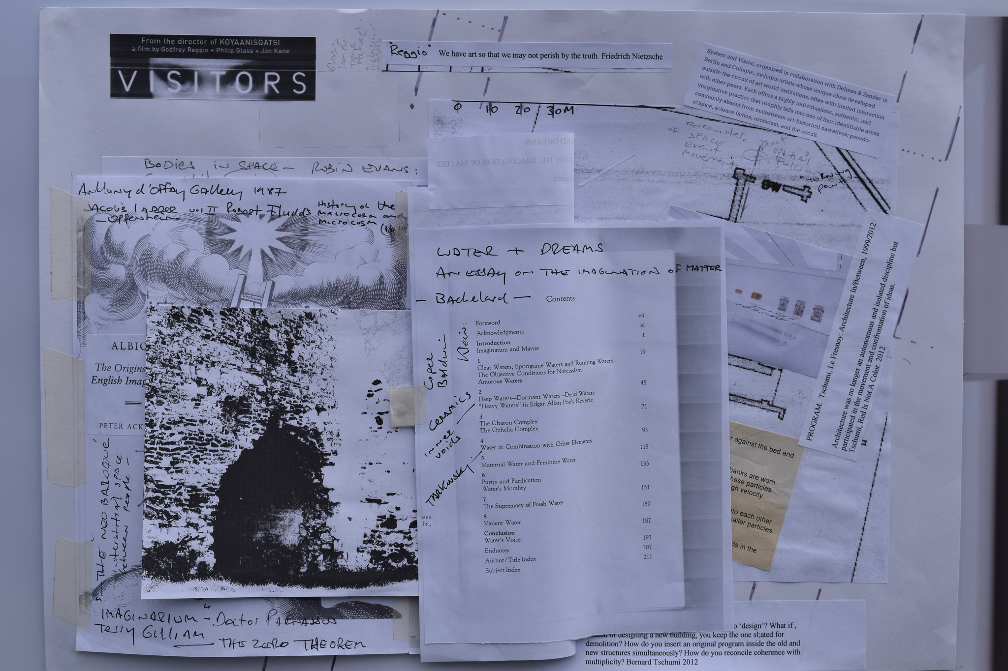 Site drawings, archaeology of found objects, anthropological observations, time based media, architectural plans.