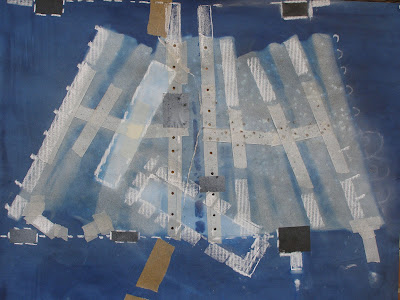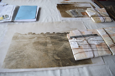Drawings, wax and yellow ochre on layered canvas and paper.